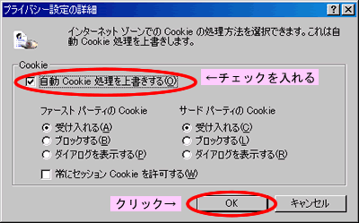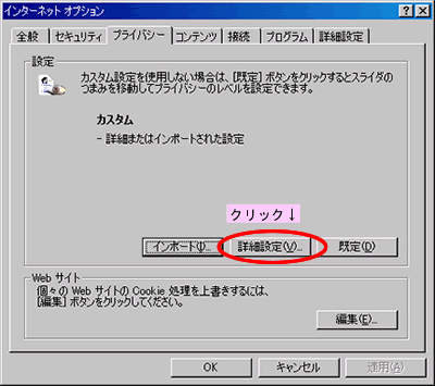 「商品情報を取得できませんでした。お手数ですが、もう一度やり直してください」 との画面が出た場合は、下記の内容をお確かめください。 Internet Explorer 6.0 又は、Internet Explorer 5.5 SP2 をご利用の方で買い物かごが使えない方(Cookieを取得できない状態にある)という場合は下記をご覧ください。 特にInternet Explorer 6.0の場合、初期設定のままだとほとんどの場合にこの現象が出ているようです。ブラウザの設定、操作そのものが正しいかどうかは保証できませんが不都合の起きている場合は試してみてください。 ●Internet Explorer 6.0 の場合 1.[ツール]-[インターネットオプション]-[プライバシー]-[詳細設定]を選択する ![]() 2.「自動Cookie処理を上書きする」にチェックをつけて[OK]を押す ![]() 3.[全般]タグを選択し、[Cookieの削除]を実行する 4.[OK]を押してウィンドウを閉じる ●Internet Explorer 5.5SP2 の場合 1.[ツール]-[インターネットオプション]-[セキュリティを選択]-[レベルのカスタマイズ] 2.セッションごとの Cookieの使用許可が(有効にする)にチェックがあるか確認 3.セキュリティのレベルが中、または、中低になっているか確認 4.[OK]を押してウィンドウを閉じる ●それでも解消しない場合は下記もチェックしてください。 Windowsユーザー (インターネット一時ファイル)キャッシュを捨てる! 上記のブラウザの設定でもうまく行かない場合に下記を試してみてください。Temporary Internet Files というところのファイルを削除することにより、ハードディスクの空きスペースが増えます。メモリーに余裕のない場合に有効のようです。 ブラウザの設定 1.[ツール]-[インターネットオプション]-[全般]-[ファイルの削除]を選択する 2.[ファイルの削除][OK]を押す 3.[OK]を押してウィンドウを閉じる それでもご注文できない場合は、こちらまでご連絡ください。 お電話にてご注文を承ります。 青みかん本舗 aomikan.com Copyright(C) 2007 Daliy.Inc All Right Reserved |